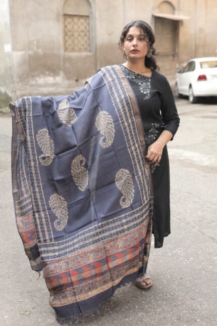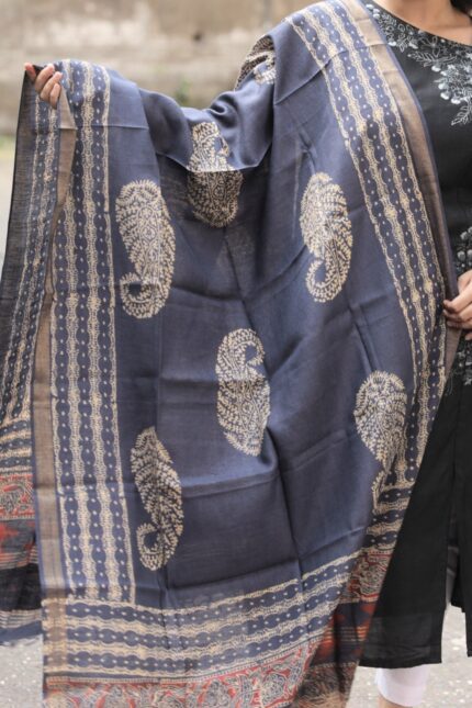 Handcrafted Block Printed Kosa Silk Dupatta (Blue)