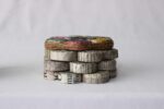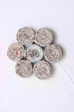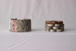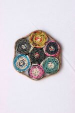 Our beautifully crafted one of a kind rolled paper coaster set includes four coasters with a matching coaster holder. All are coated with a waterproof finish. Each coaster measures about 3″ x 3″. Because of their handmade nature, each coaster set is unique and will vary slightly in look from the set pictured.