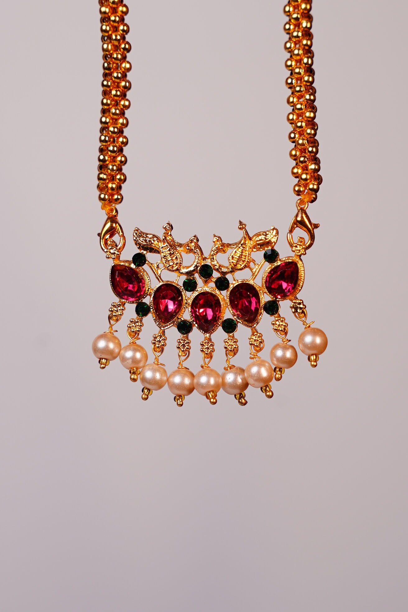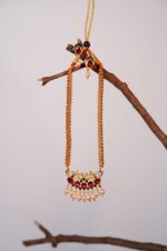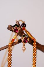 Elevate your style with this stunning gold-plated necklace and earring set, beautifully adorned with rich ruby-colored stones and luminous pearls. The deep red hues add a touch of timeless glamour, while the soft glow of the pearls creates a perfect balance of elegance and sophistication. Designed to complement both traditional and modern outfits, this set is ideal for weddings, festive occasions, parties, or as a thoughtful gift for someone special. A graceful jewelry set that adds luxury and charm to any look.
