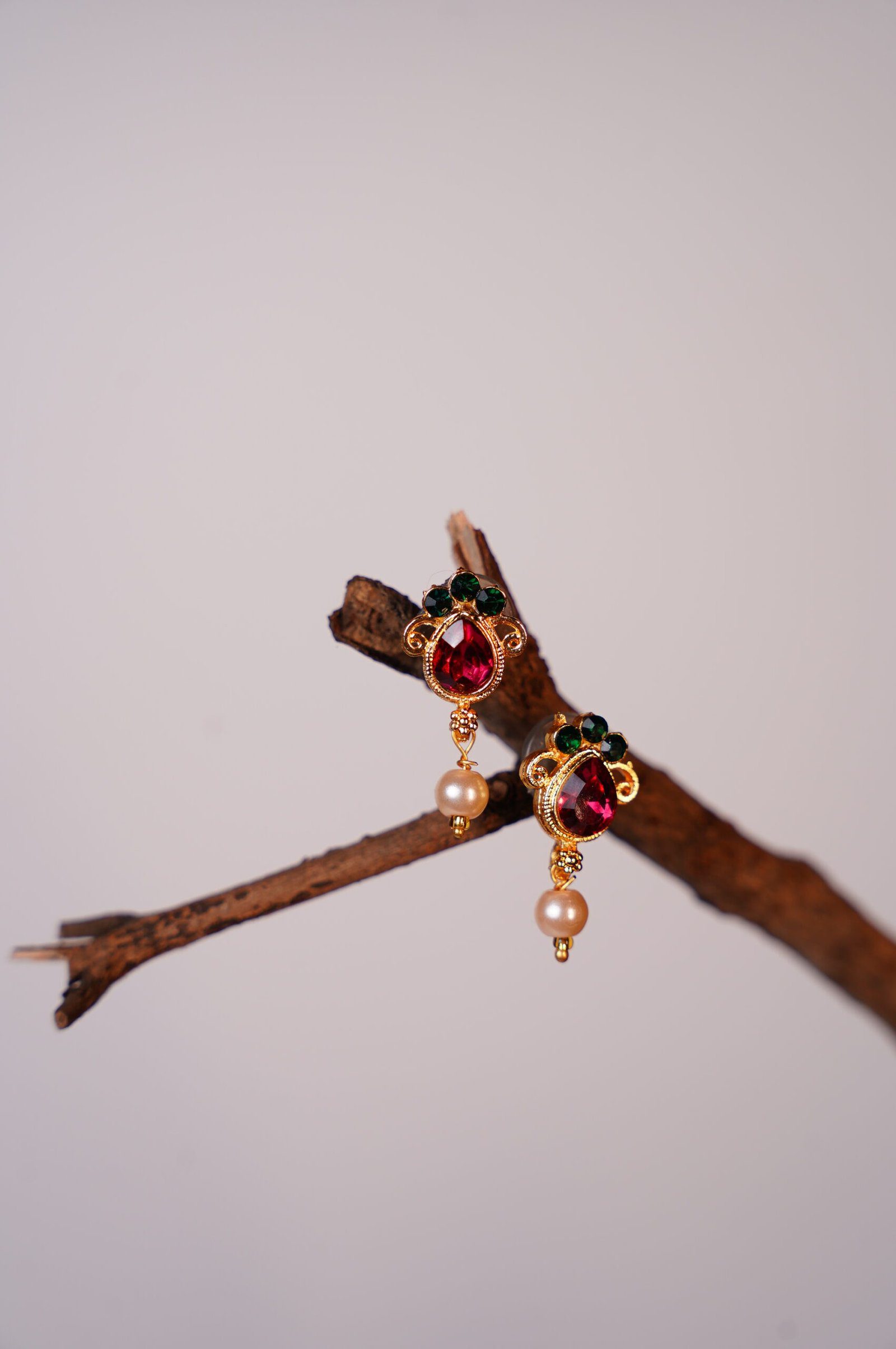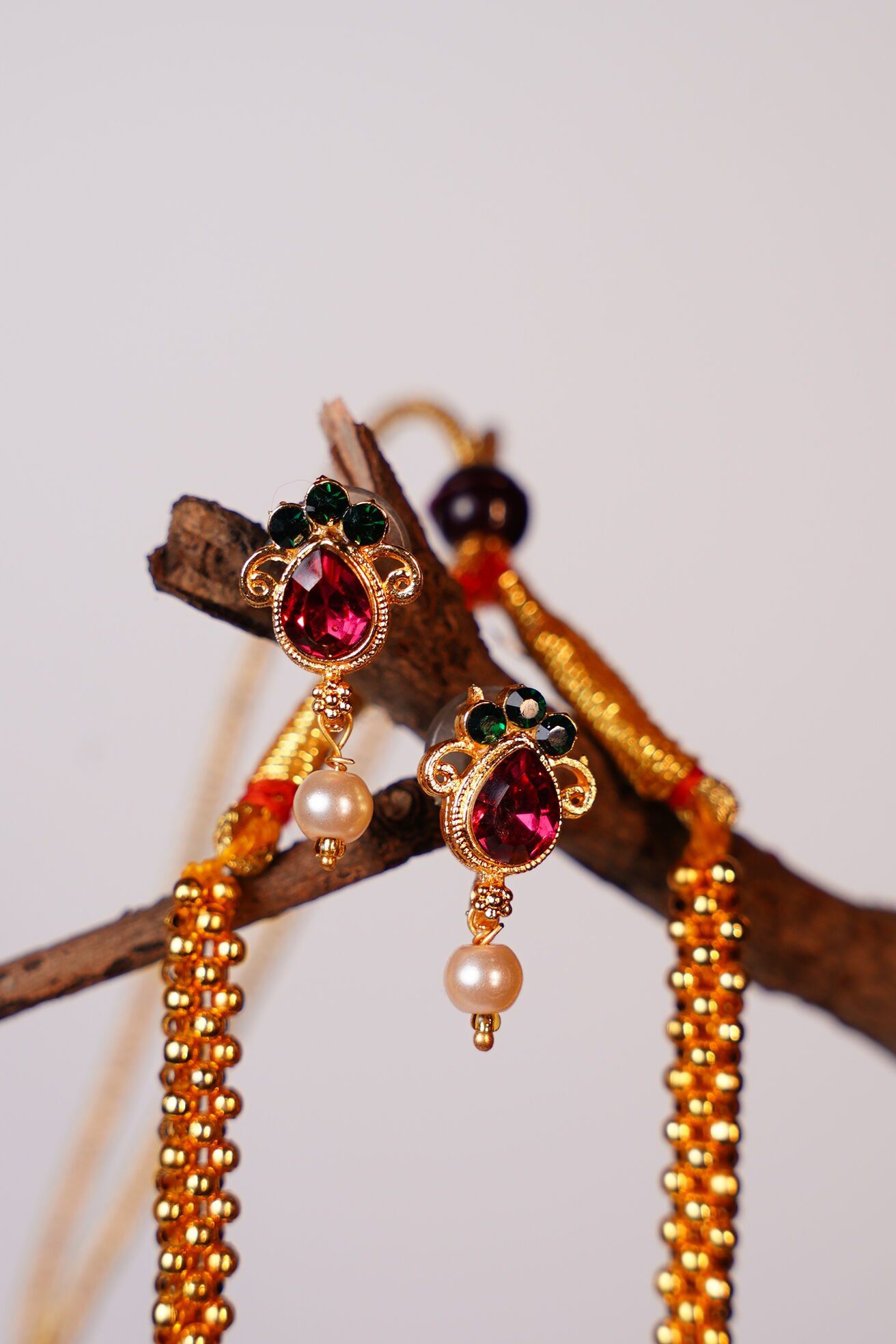 Gold-Plated Necklace & Earring Set with Ruby-Colored Stones and Pearls