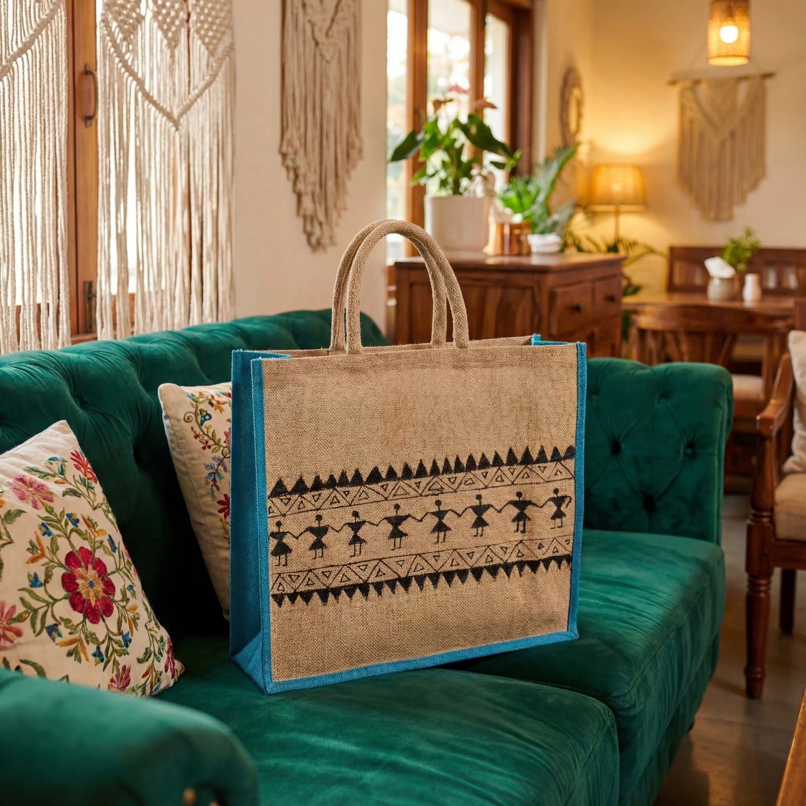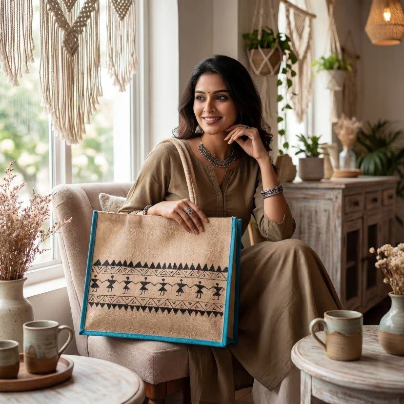 This Hand-printed Jute Bag is a practical and stylish choice for your daily shopping trips and casual outings. Made from natural jute material, it combines durability with a beautiful traditional look that stands out from ordinary bags. The bag features authentic Warli tribal art hand-painted directly onto the fabric, giving it a unique artistic touch that tells a story of Indian folk culture. With its spacious main compartment and sturdy nawar belt handles, this tote bag is perfect for carrying groceries, everyday items, or whatever you need. It’s designed to be hand-washable, so it stays fresh and clean with minimal effort. Unlike plastic bags that harm the environment, this jute bag is reusable and eco-friendly, making it a smart choice for anyone who cares about sustainability. Whether you’re heading to the market, running errands, or looking for a meaningful gift, this bag brings together functionality, beauty, and environmental responsibility in one product.