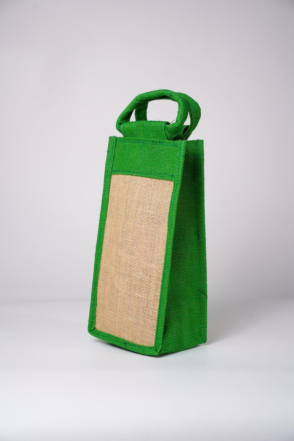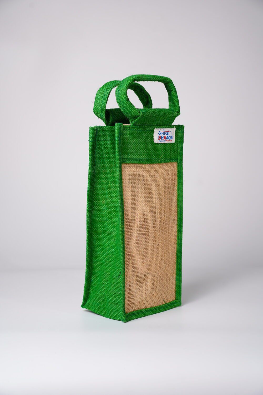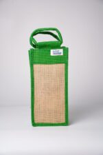 Present your bottles and gifts in a sustainable and stylish way with this eco-friendly jute bottle bag. Handcrafted from natural jute fiber, this slim and sturdy bag is designed to securely hold wine bottles, water bottles, or specialty gift items. The contrasting green border and handle add a fresh, elegant look while ensuring easy carrying.