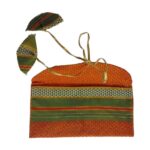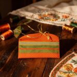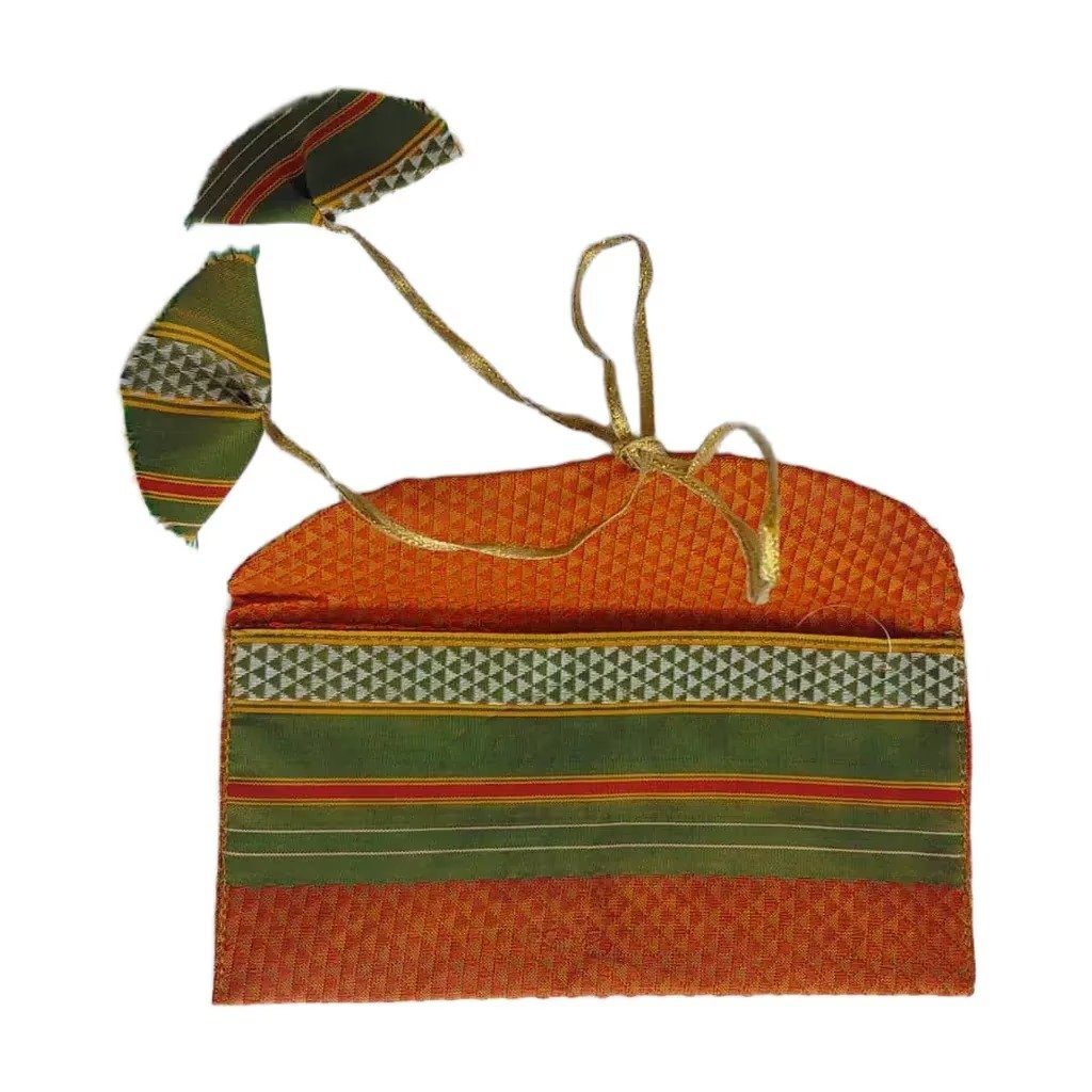 This handcrafted envelope pouch is a beautiful traditional gift package made from high-quality Khun fabric. It combines vibrant colors like orange, red-orange, olive green, and golden yellow to create an eye-catching design perfect for special occasions. The envelope features a decorative golden ribbon tie with fan-shaped fabric ornaments that add an elegant touch. This piece is ideal for gifting sweets, chocolates, jewelry, or small items to loved ones during festivals, weddings, and celebrations. Made by skilled artisans using traditional methods, this pouch brings authentic Indian craftsmanship to your home. The structured design with a curved flap and clean stitching shows the quality and care put into every piece. Whether you need a festive gift box for a wedding, a sweet container for Diwali, or a decorative pouch for special events, this handcrafted envelope works perfectly. Its reusable nature makes it an eco-friendly choice that your guests can treasure long after the occasion ends.