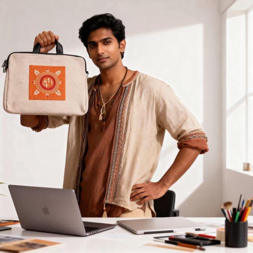 This handcrafted laptop bag combines traditional Indian folk art with modern functionality. Made from natural jute material, it’s designed to protect and carry laptops between 13-15 inches while making a style statement. The bag features a stunning orange decorative patch with circular patterns and leaf elements inspired by traditional Indian art forms. Perfect for professionals, students, and creative workers who want to carry their devices safely while showing off authentic artisan craftsmanship. The padded interior keeps your laptop secure during travel, while the compact design fits easily into your daily routine. This isn’t just a laptop bag—it’s a piece of wearable art that supports traditional craftspeople and brings ethnic style to your everyday carry.