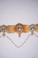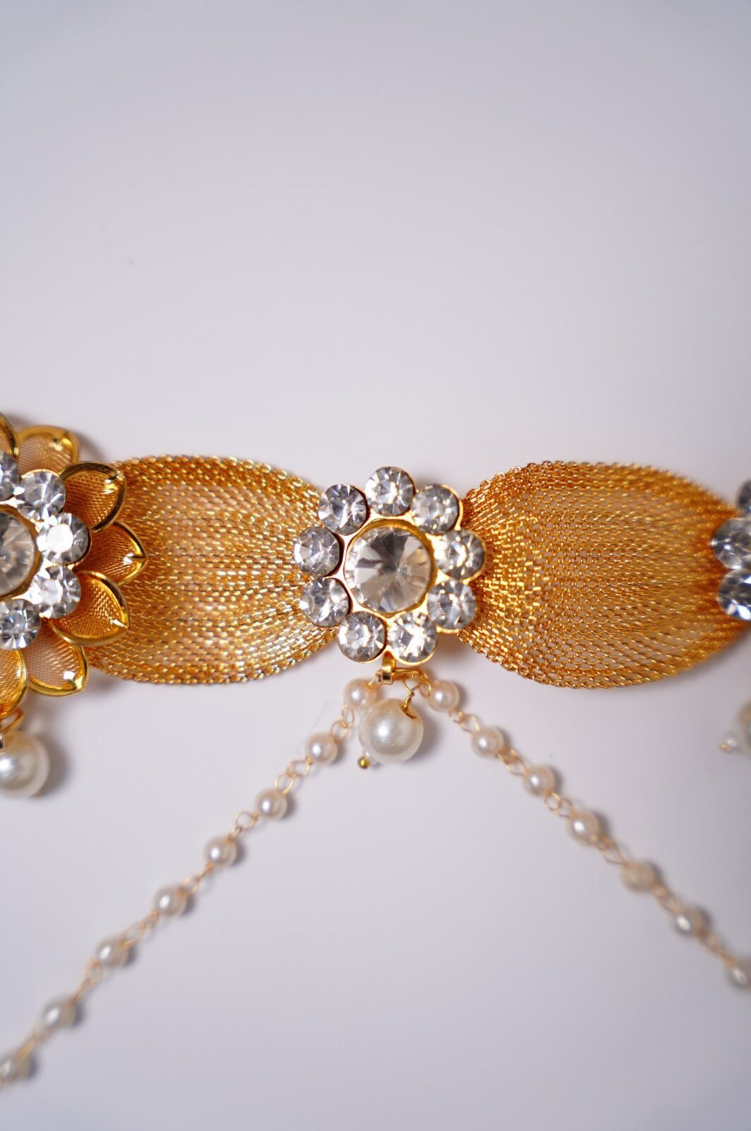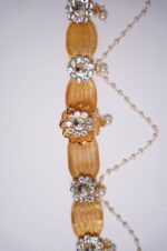 The pearls create a graceful, feminine flow, and the rhinestones catch the light with every movement, making the Kamarpatti visually striking yet refined. Often, a decorative central motif or clasp showcases detailed craftsmanship with floral or traditional patterns, enhancing its regal appeal.