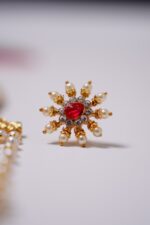 At the center lies a striking Chakra-shaped pendant, intricately crafted and adorned with traditional kemp stones in deep red, often accented with green highlights. The chakra motif symbolizes power, protection, and divine energy, making the pendant both meaningful and visually captivating. Gold-toned detailing with antique finishing enhances the traditional appeal of the design.