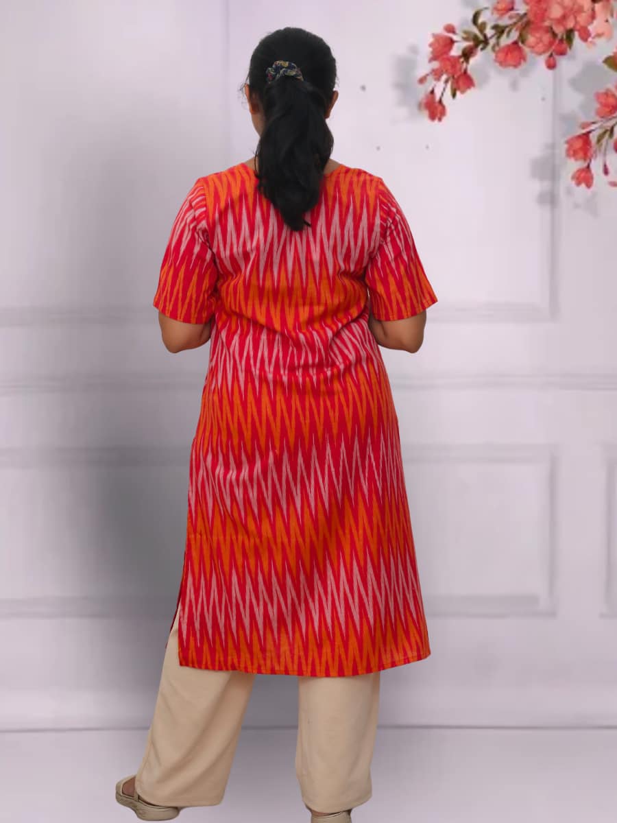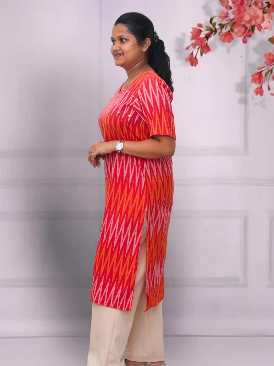 An Ikat long kurta is a traditional yet contemporary outfit crafted from handwoven Ikat fabric, featuring vibrant, blurred patterns. Its comfortable fit and elegant design make it ideal for casual, festive, or formal occasions.