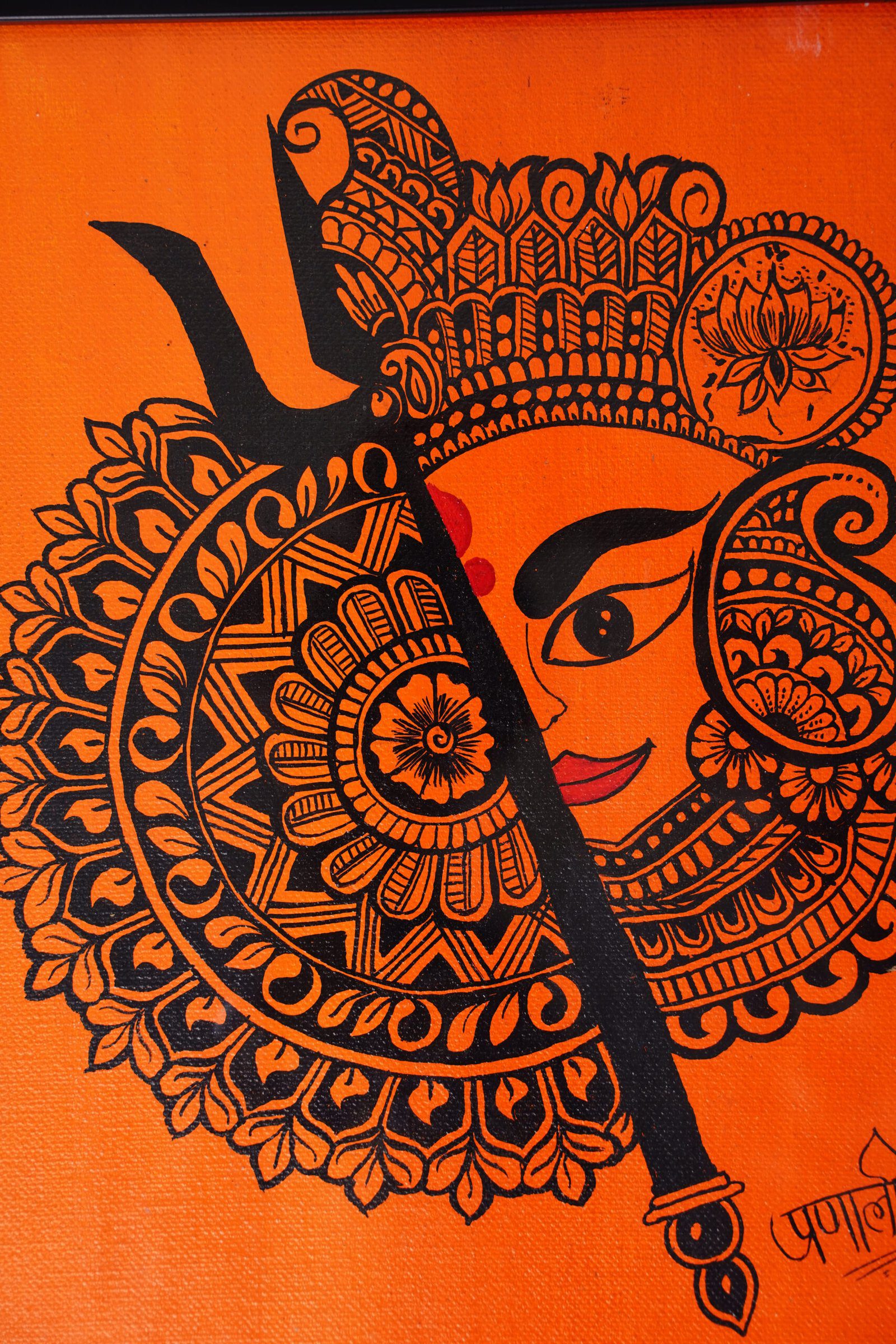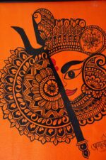 This Maa Durga Mandala Art Painting Frame is a striking fusion of devotion and intricate folk-inspired mandala art. Handpainted with fine black detailing on a vibrant orange background, the artwork beautifully depicts Goddess Durga’s serene yet powerful visage, symbolizing strength, protection, and divine feminine energy. The mandala patterns radiate harmony and balance, enhancing the spiritual depth of the composition.