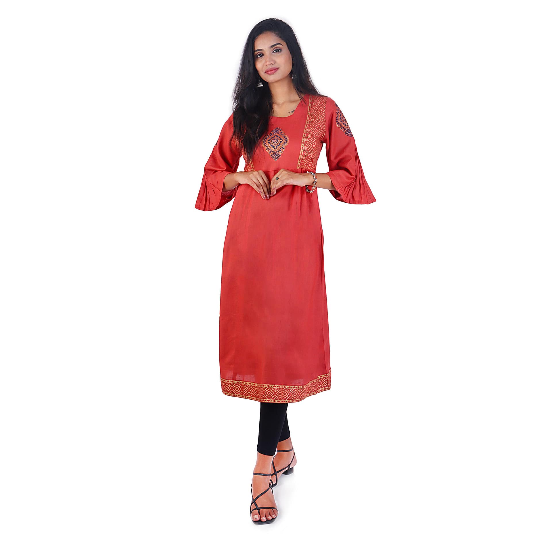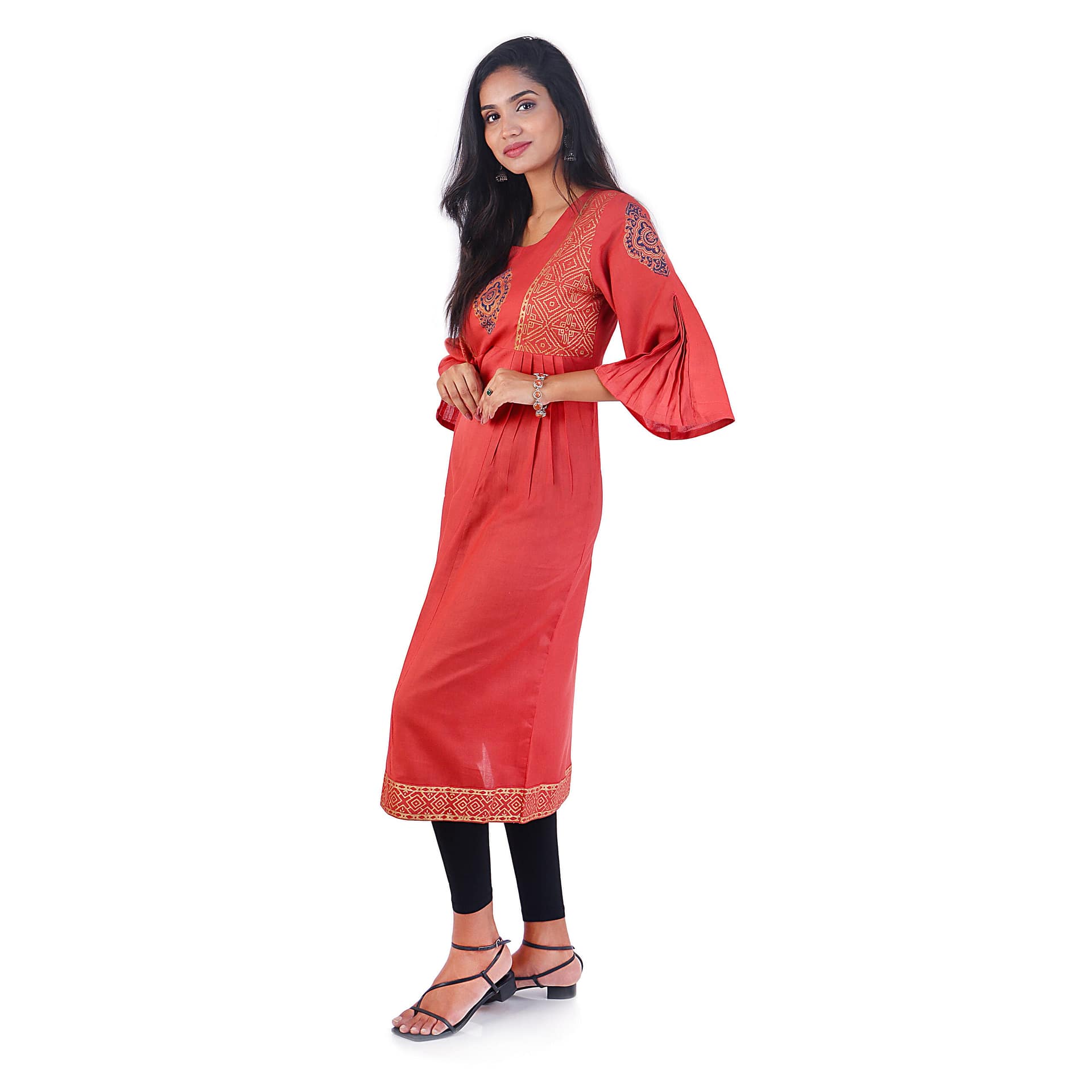 Kurti of hand block printed cotton fabric.Adding side pleated bell sleeve on the waist and creating an aesthetic fashion look,