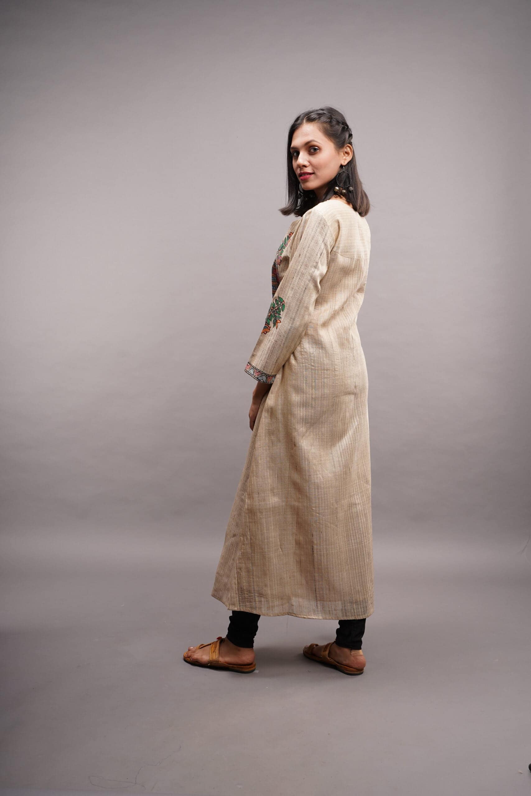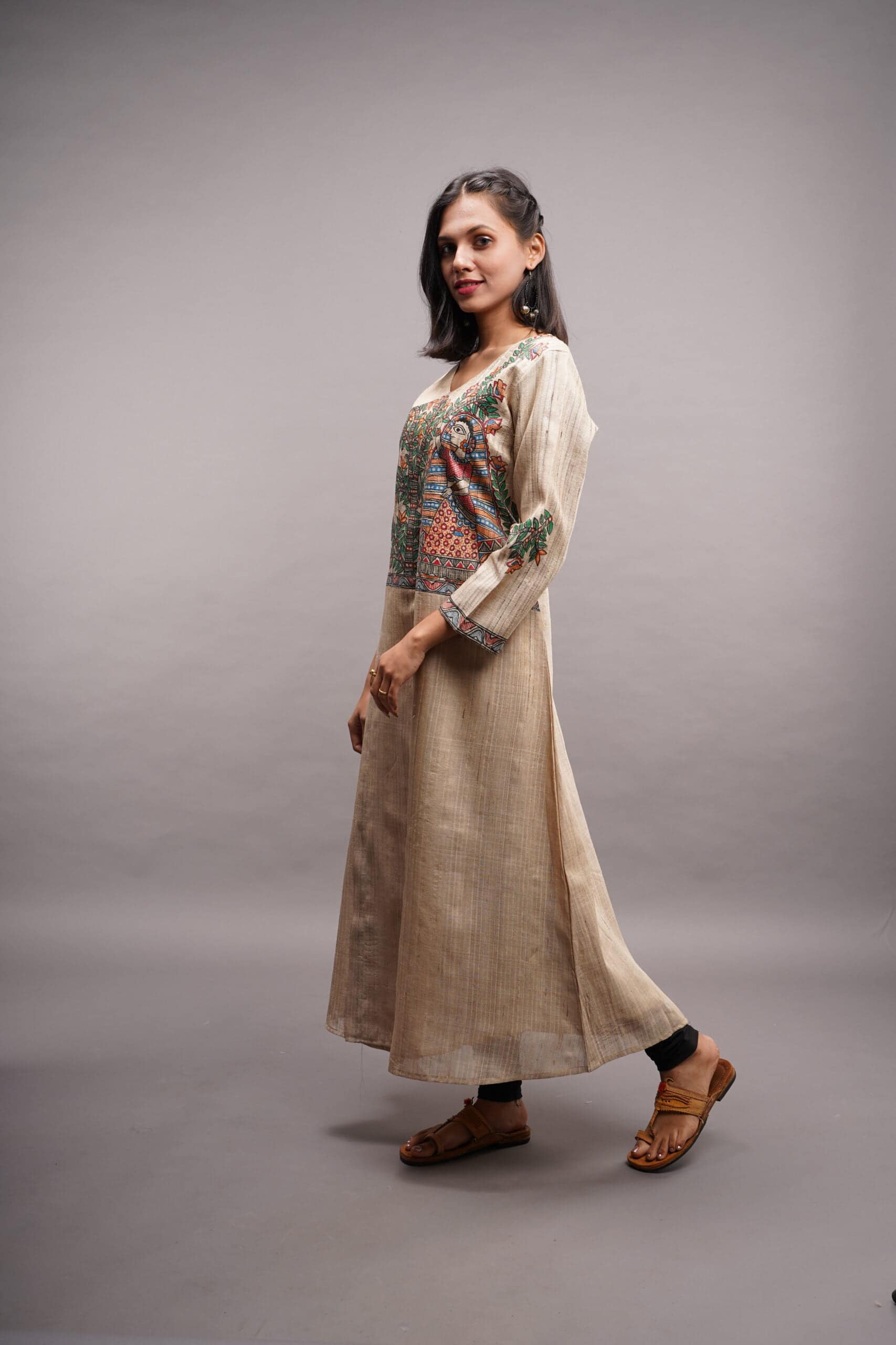 It is a long kurti. It has a design on the neck. It is joint from the waist showing a slight umbrella.