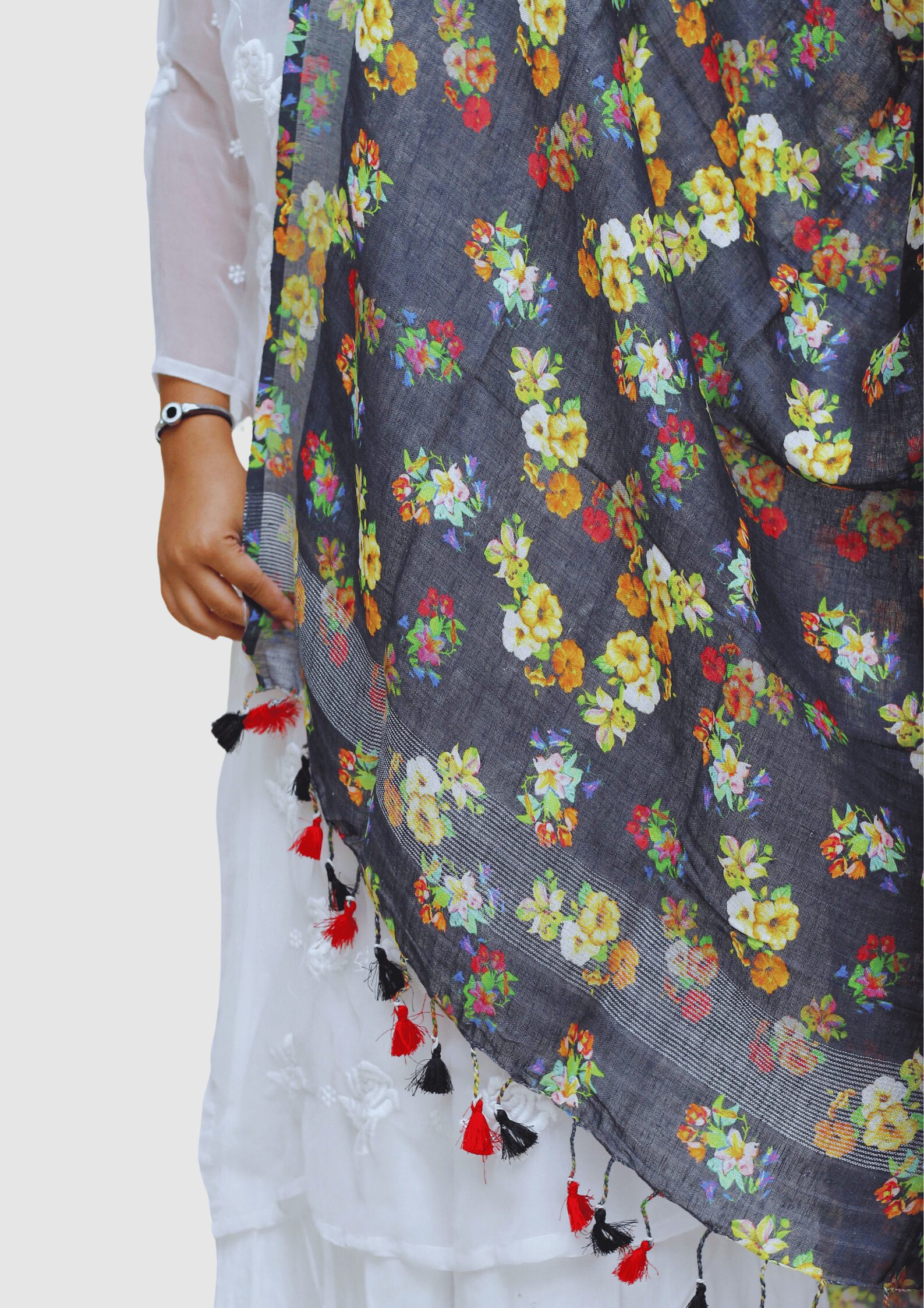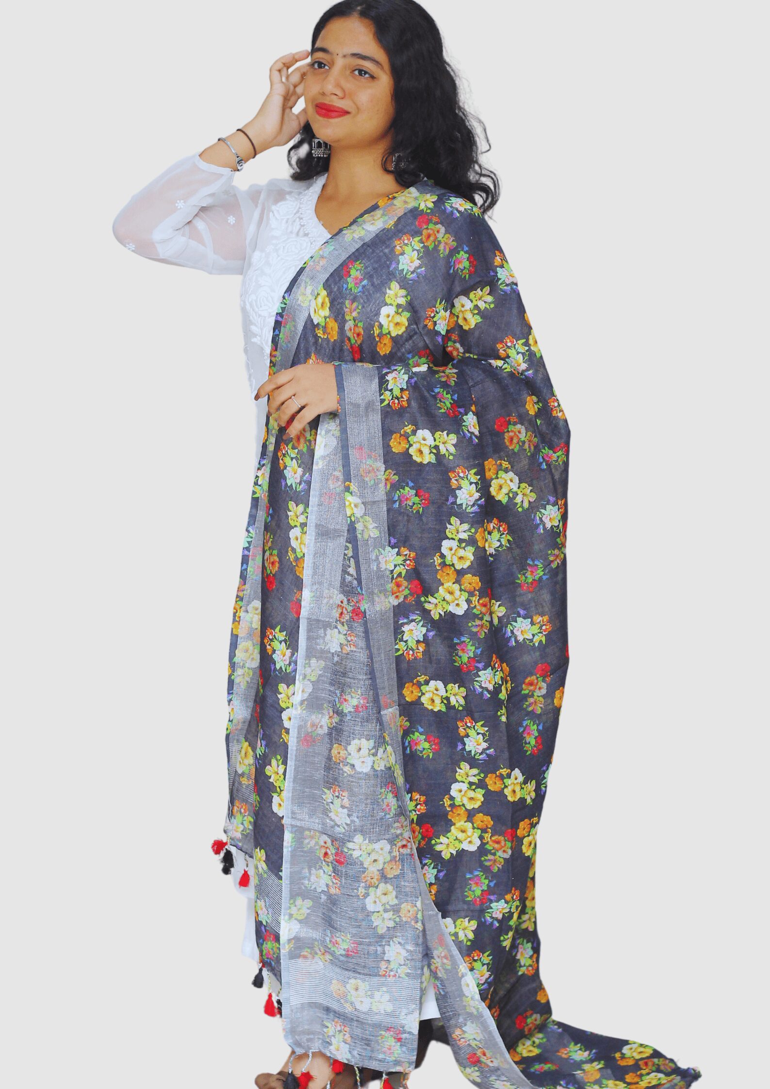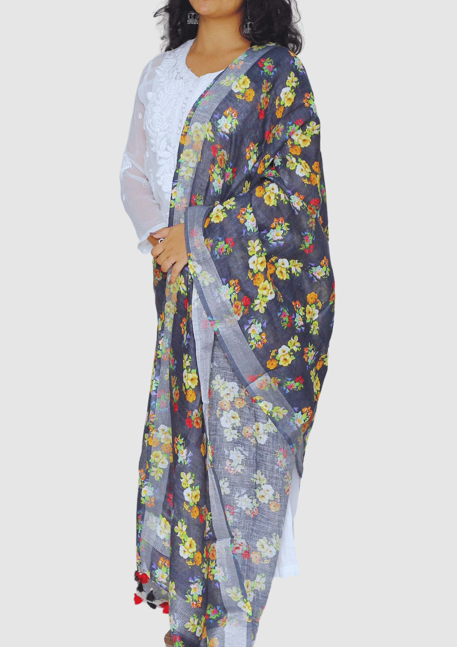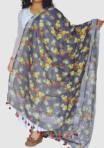 This is a Pure Linen Digital Print Dupatta with Silver border on both sides. It also has Pretty tassels on both sides