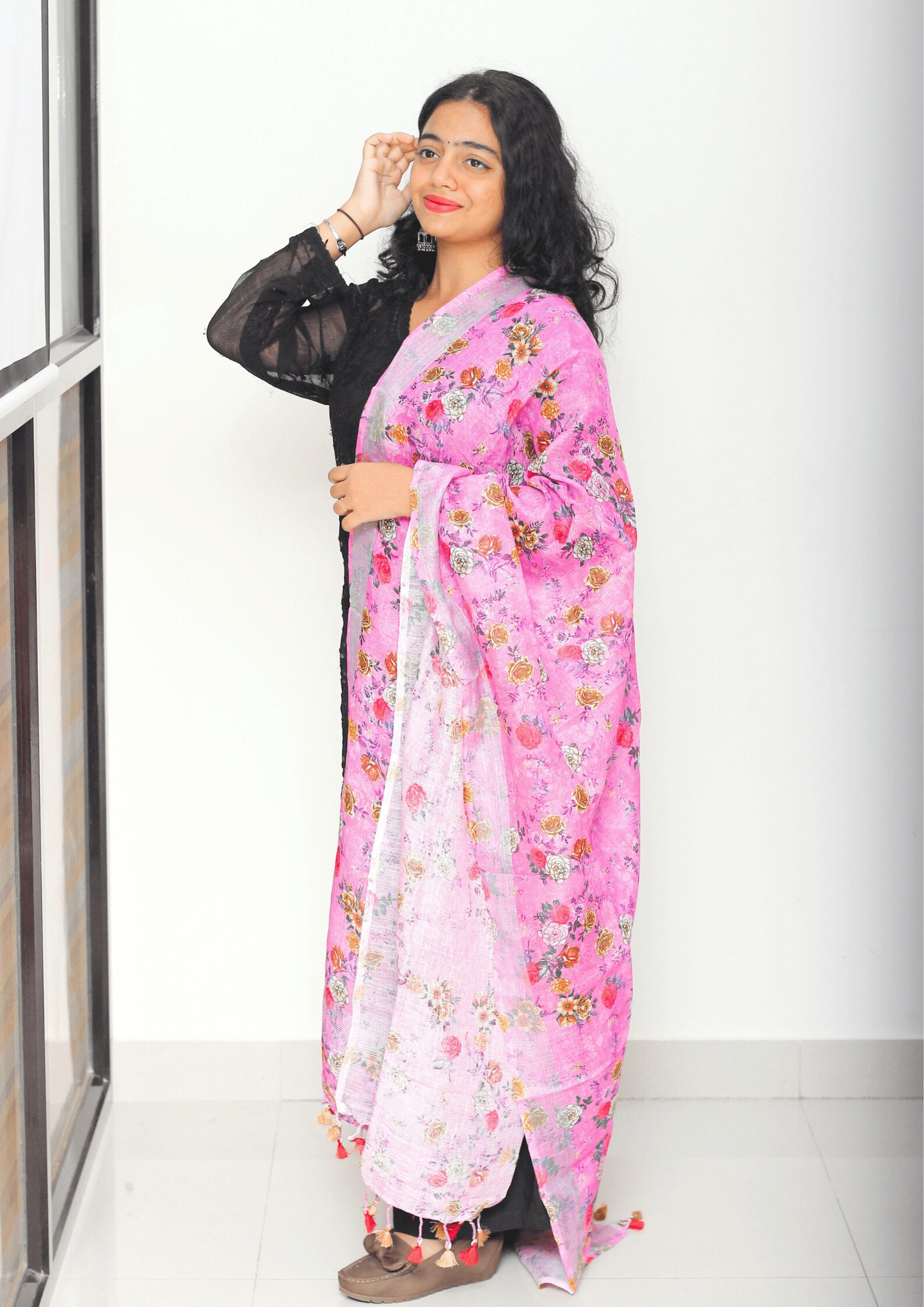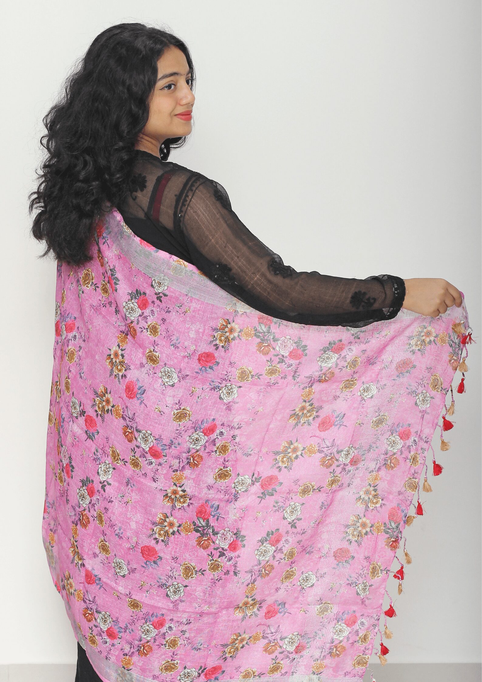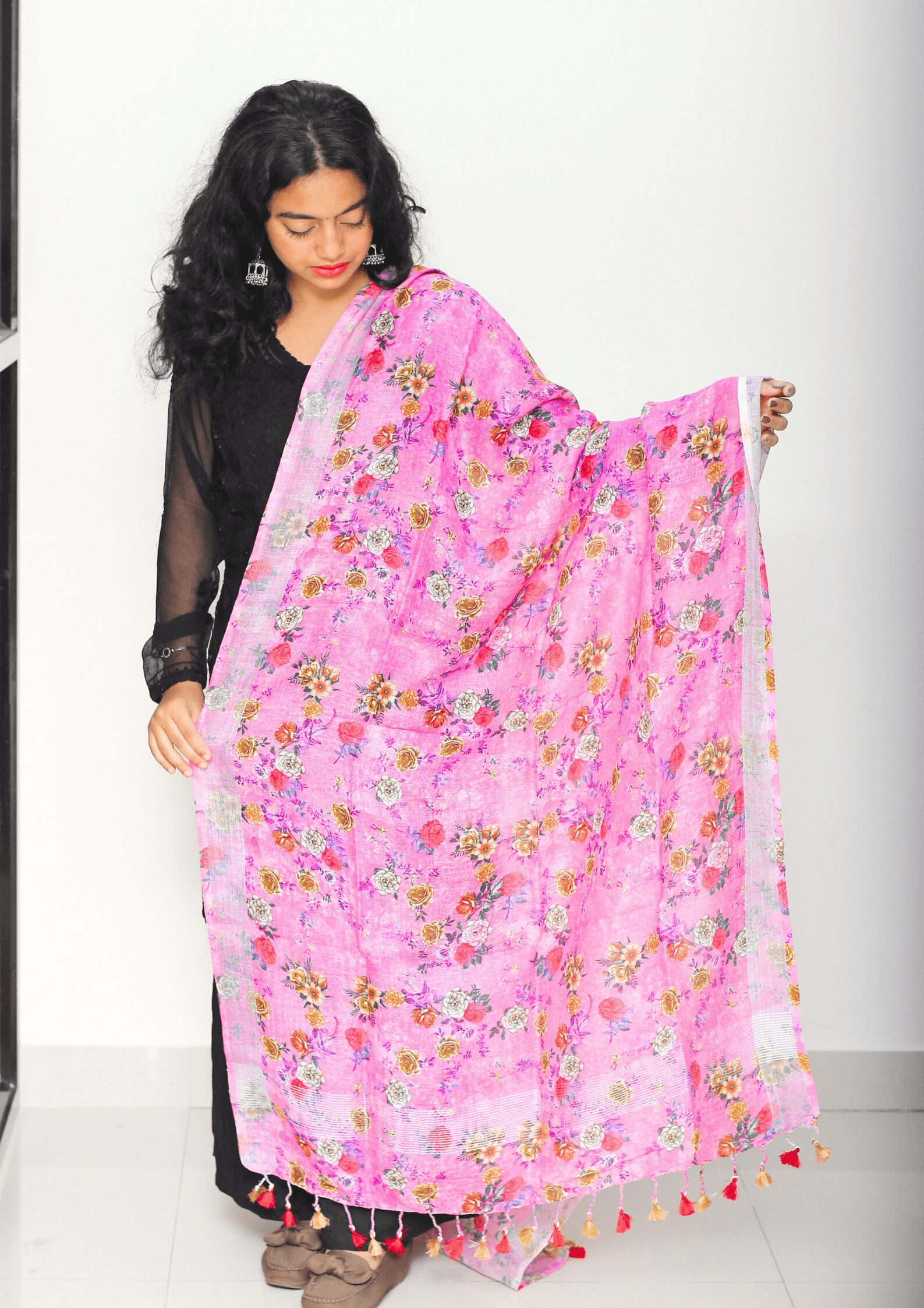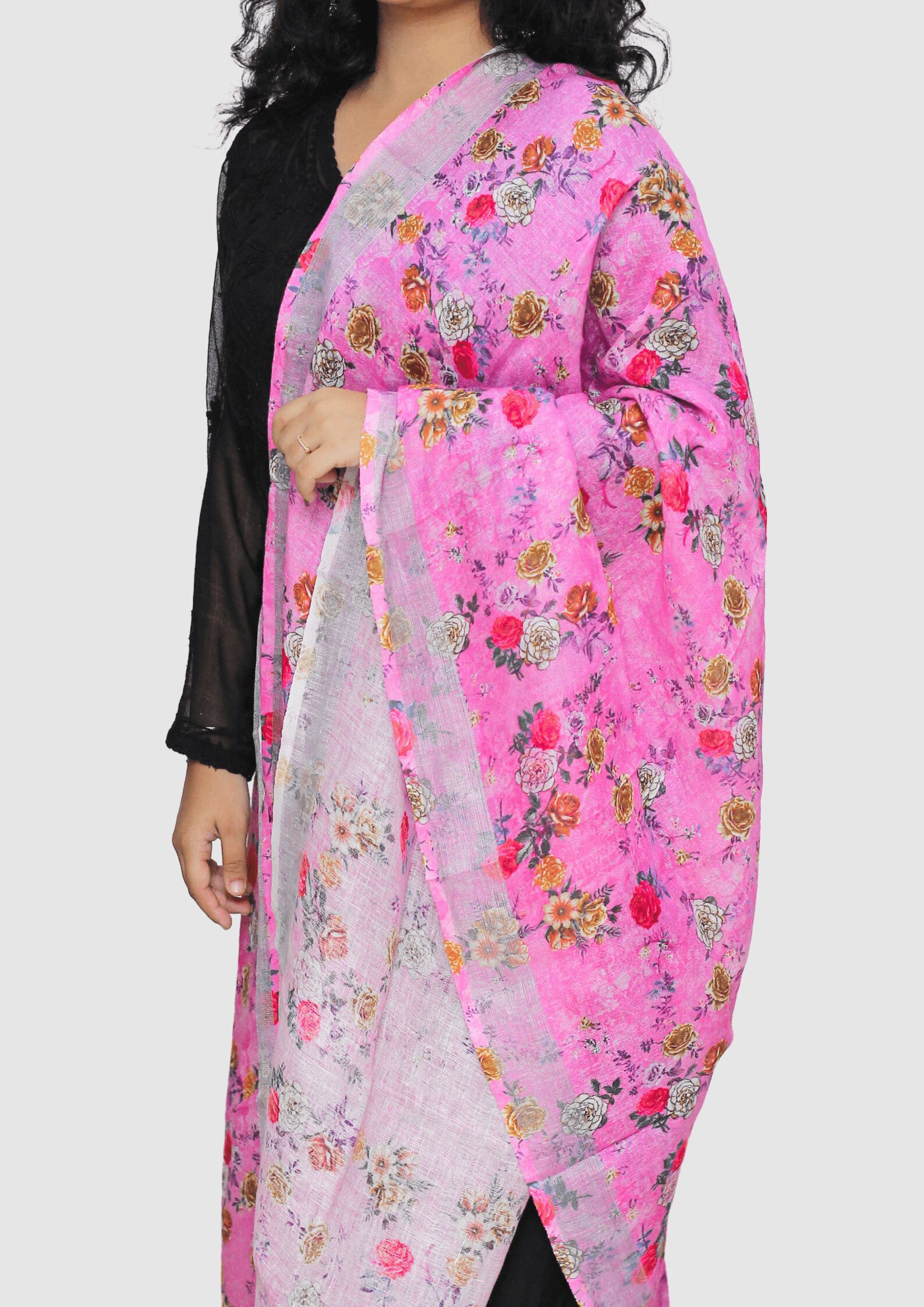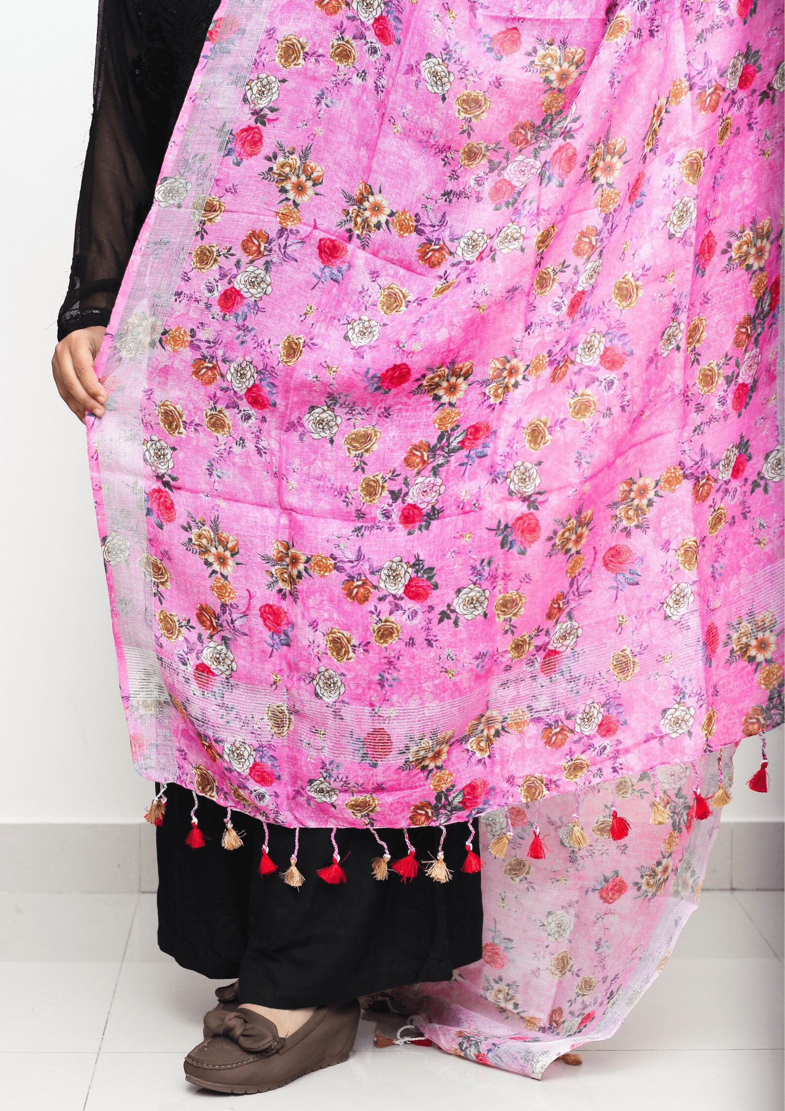 This is a Pure Linen Digital Print Dupatta with Silver border on both sides. It also has Pretty tassels on both sides