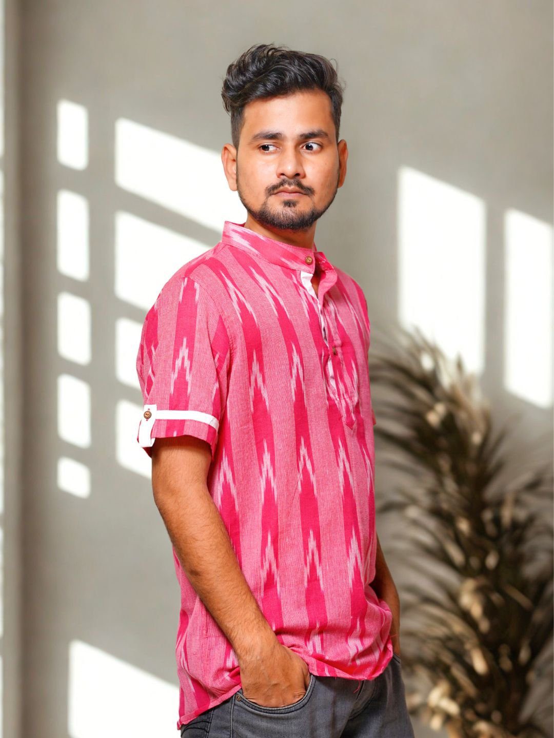 This men’s Ikat shirt features bold, handwoven patterns and breathable fabric, blending traditional craftsmanship with modern style. Perfect for casual or semi-formal wear.