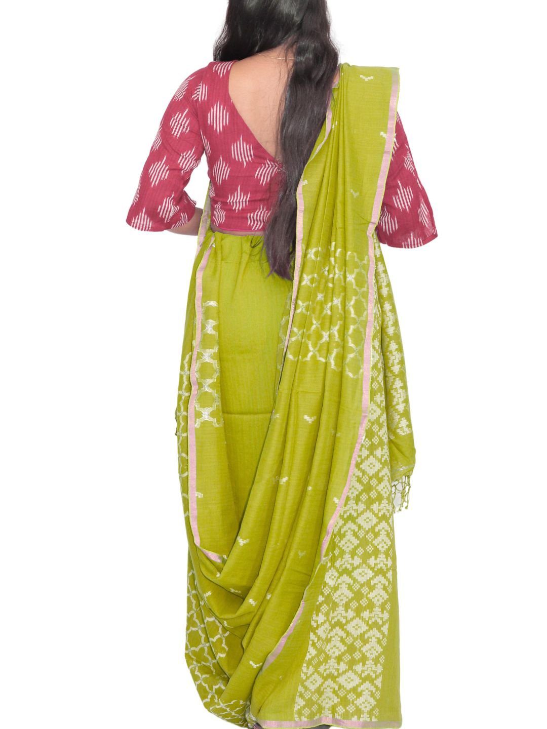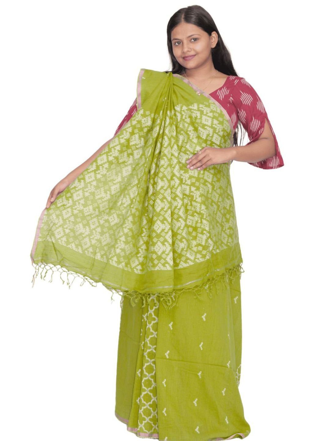 Originating from Bengal, the Jamdani technique is renowned for its sheer, lightweight texture and detailed, ornamental design. This saree typically uses fine cotton or silk, sometimes enhanced with zari (metallic thread), giving it a rich, festive look.