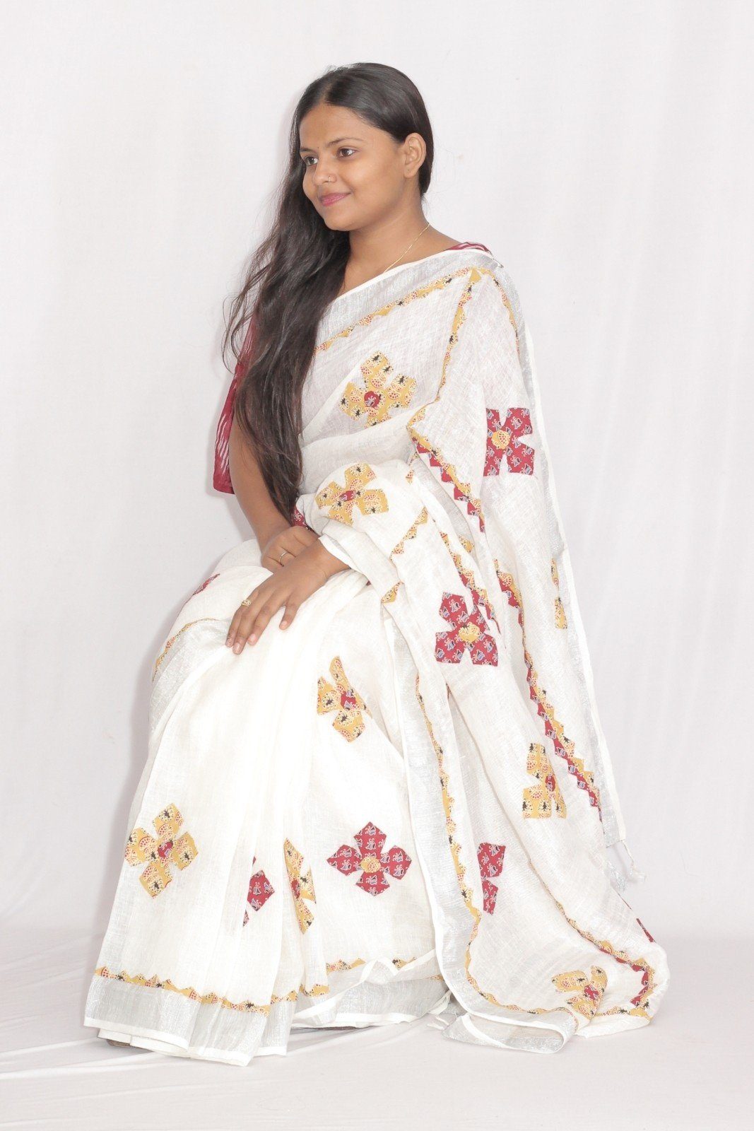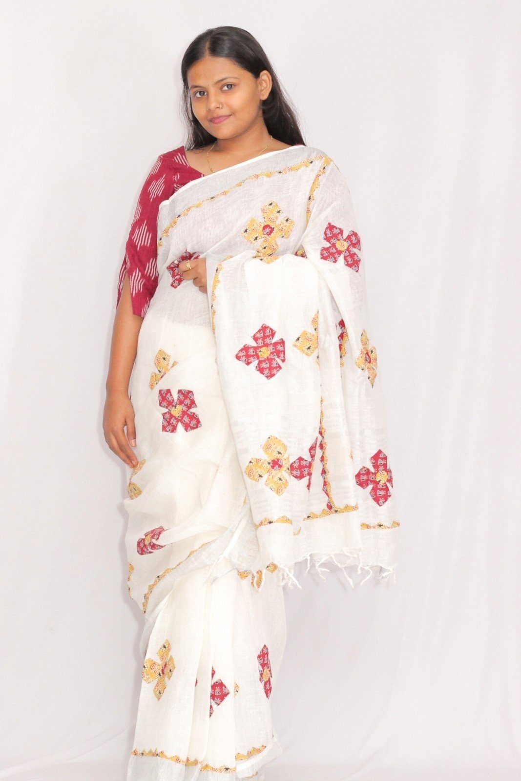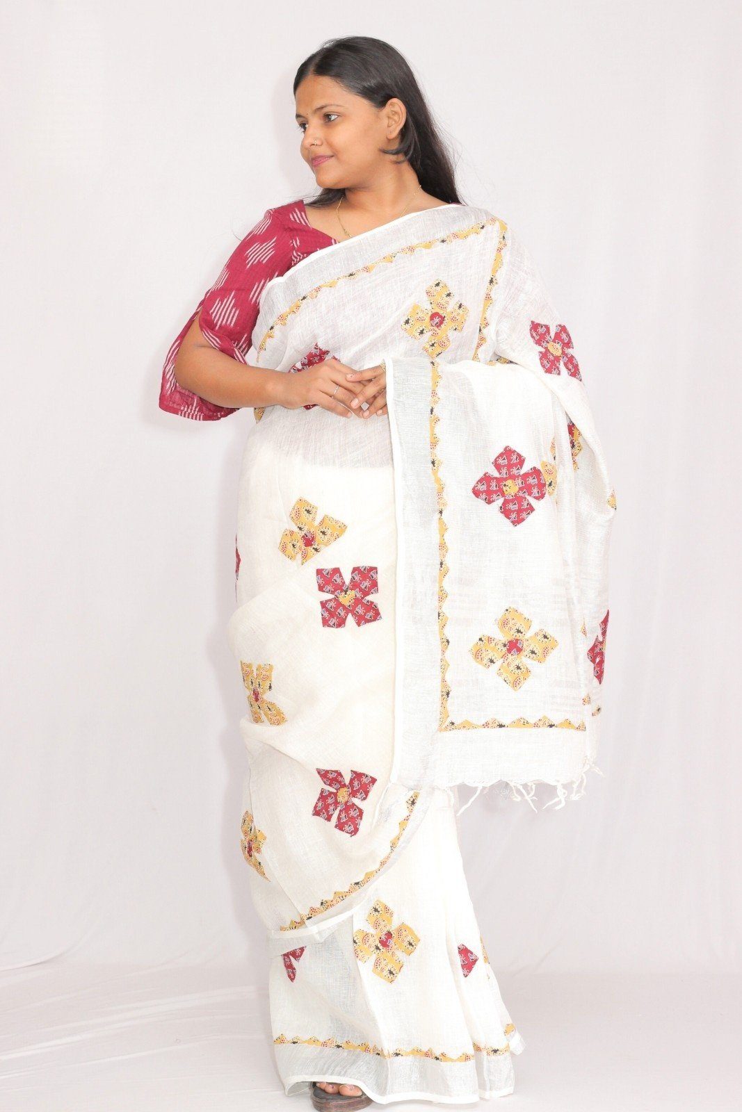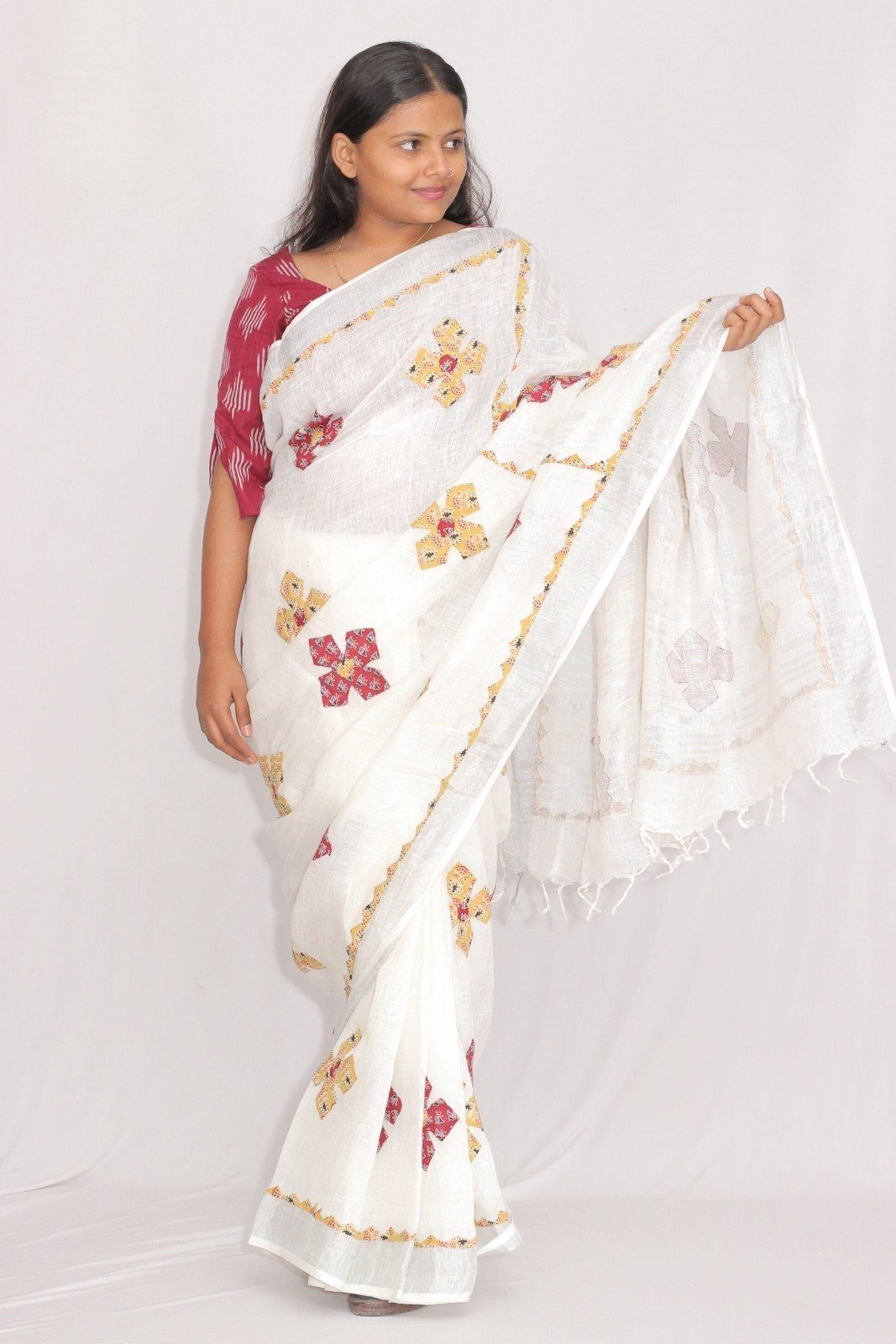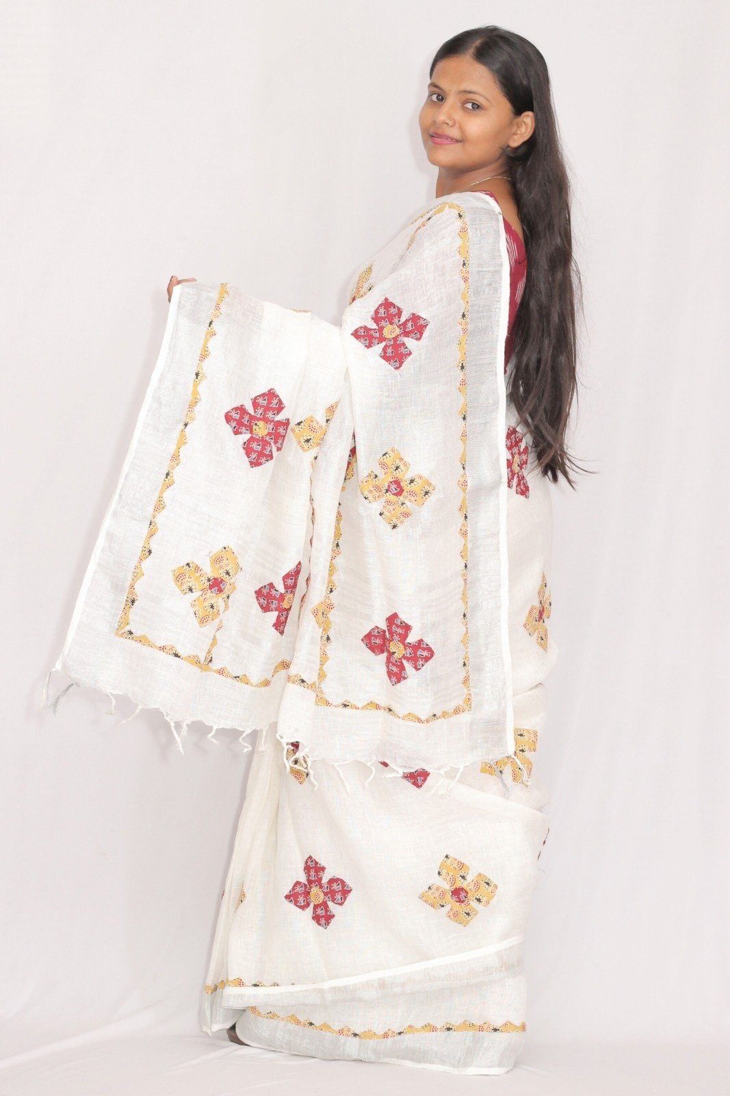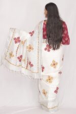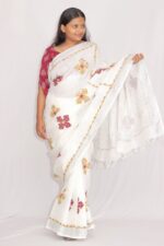 Tisser Linen Applique Cutwork Saree with Blouse Piece (White/Mix)
