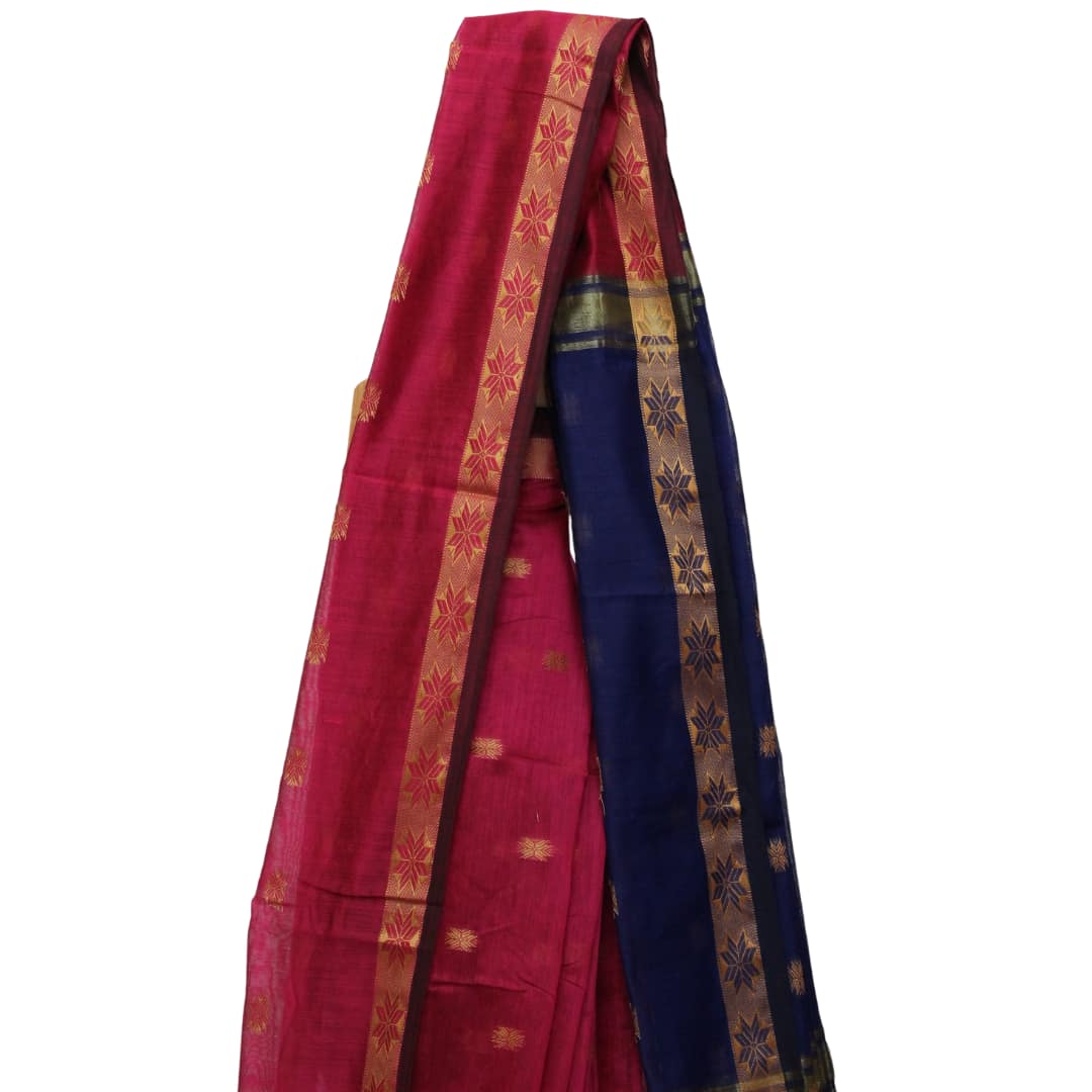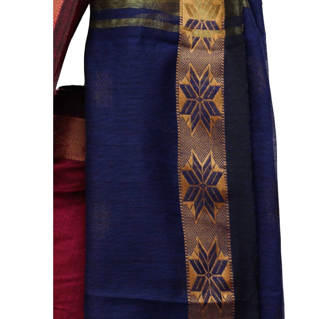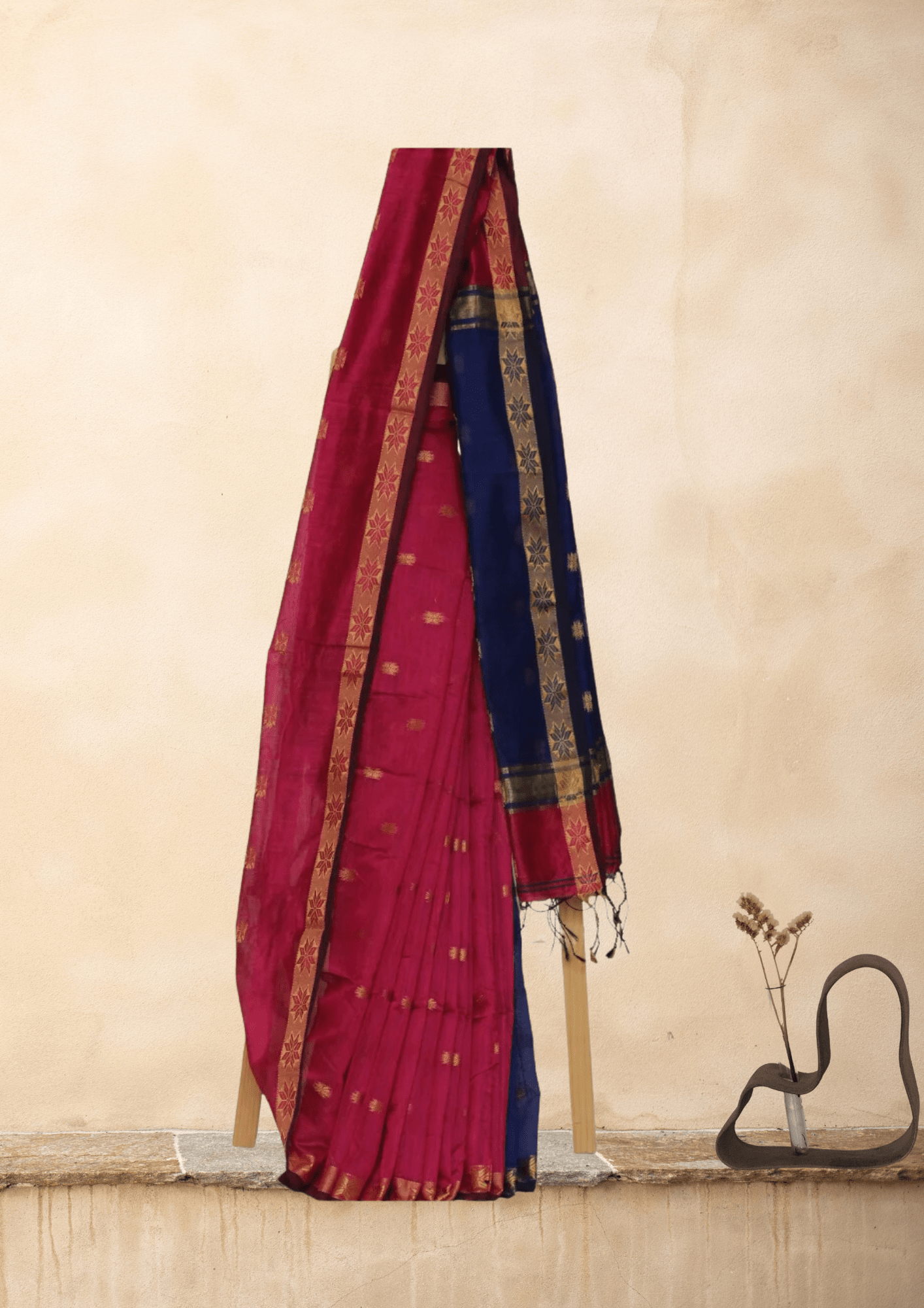 Our Pink and blue Maheshwari silk Saree is a celebration of rich, deep hues. The enchanting Maroon and black color exudes sophistication and confidence, making it a perfect choice for various occasions.