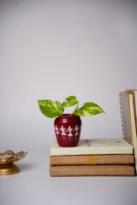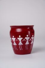 The slightly rounded form and thick rim give the pot a sturdy, rustic appeal, while the contrast between the deep terracotta color and the white artwork makes the design stand out clearly. Overall, the pot reflects the essence of Warli art: community, celebration, and harmony with nature, making it both a functional piece and a cultural decorative object.