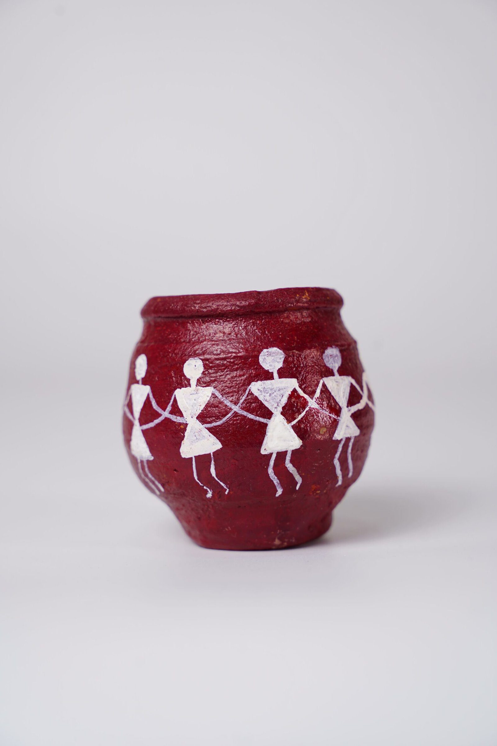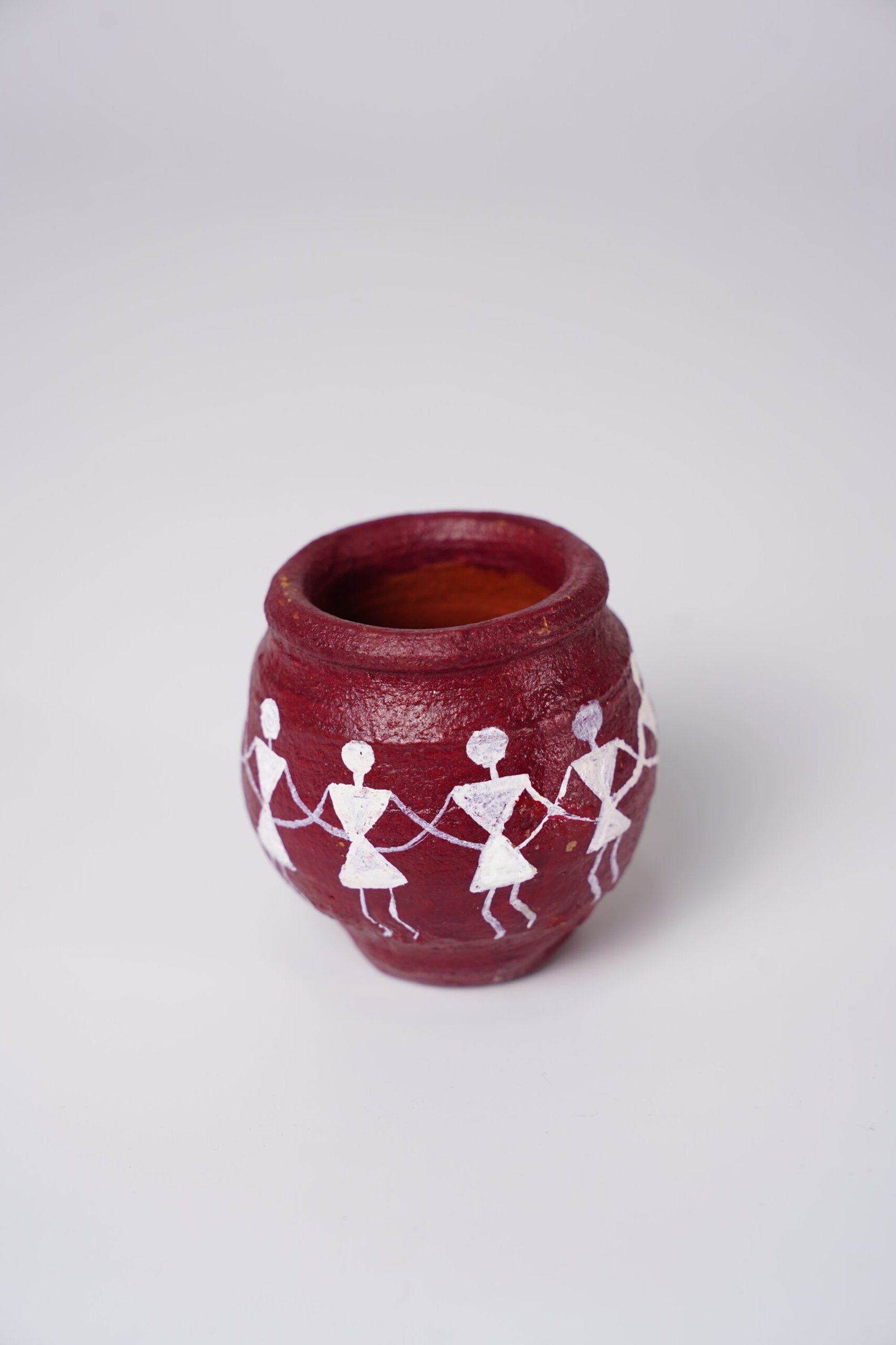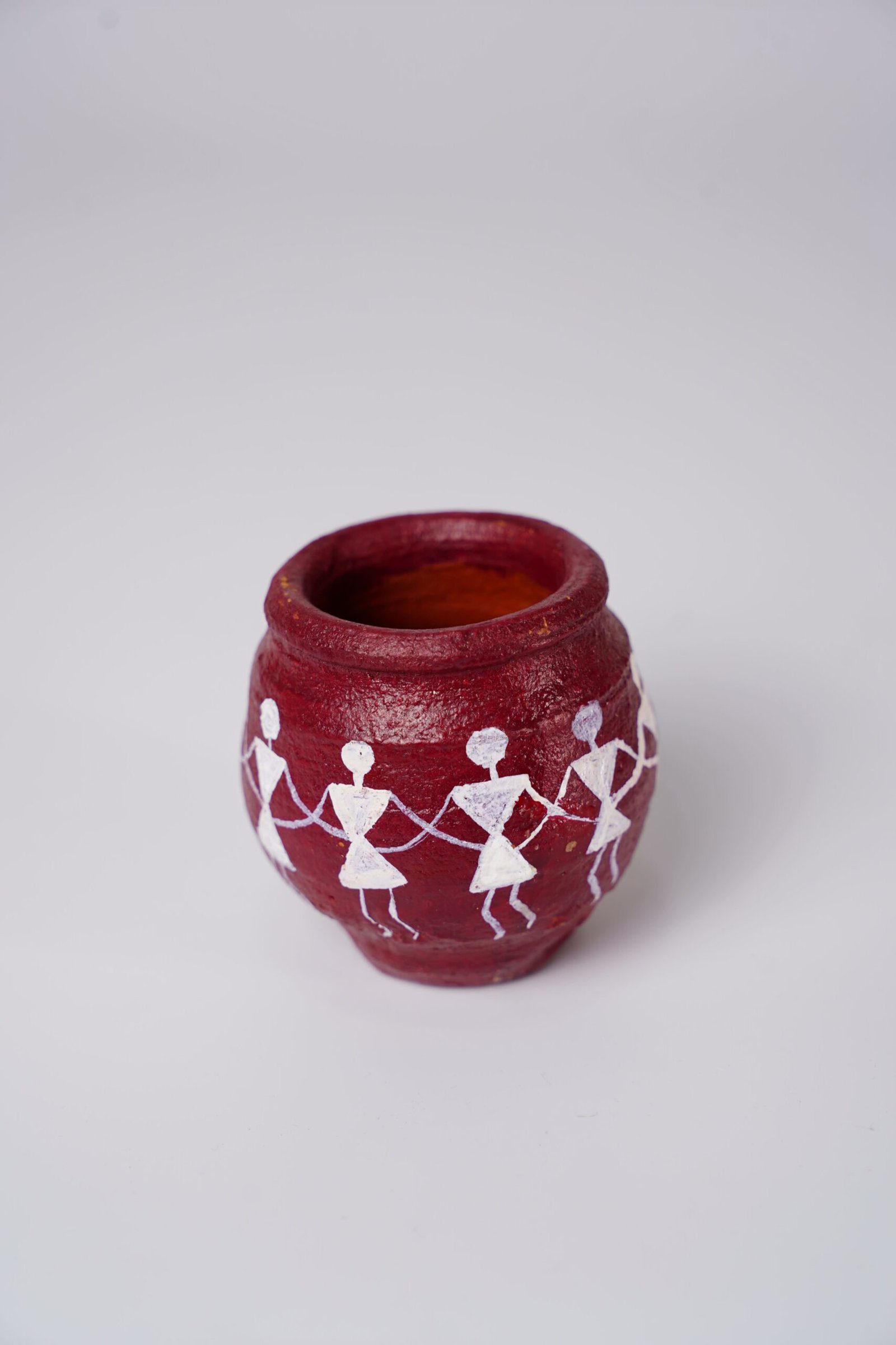 This handcrafted terracotta pot features a rich, earthy red base that highlights its natural clay texture and artisanal finish. Around the body of the pot, traditional Warli art is painted in white, depicting stylized human figures holding hands in a rhythmic dance. The figures are formed using simple geometric shapes—circles for heads and triangles for bodies—characteristic of Warli’s minimalist folk style.