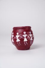 The slightly rounded form and thick rim give the pot a sturdy, rustic appeal, while the contrast between the deep terracotta color and the white artwork makes the design stand out clearly. Overall, the pot reflects the essence of Warli art: community, celebration, and harmony with nature, making it both a functional piece and a cultural decorative object.