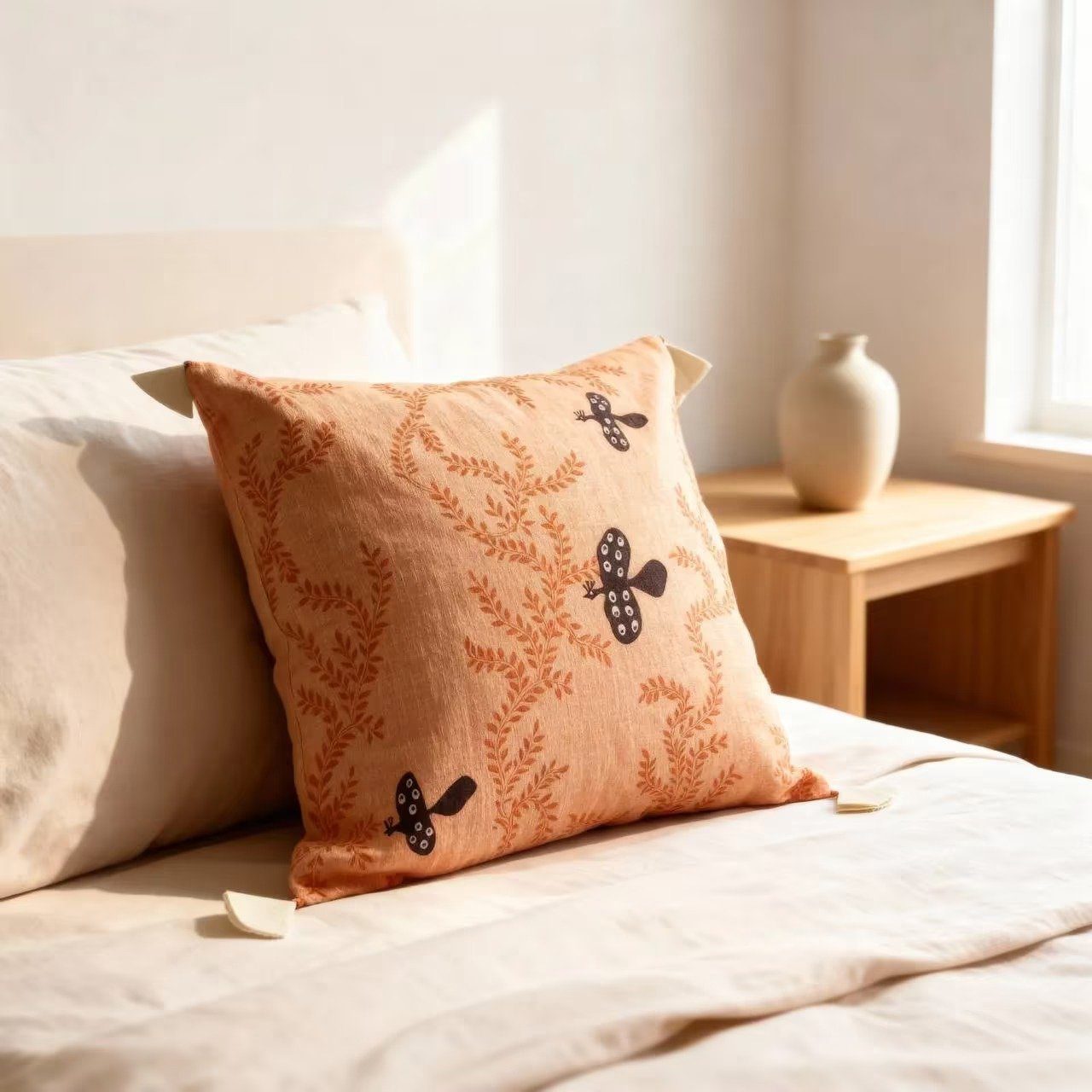 Handpainted Cotton Cushion Cover with Nature-Inspired Motifs