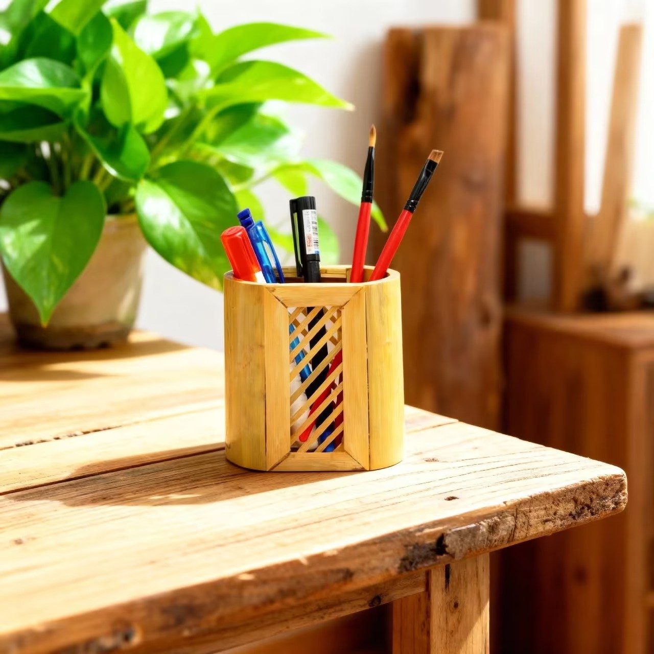 Keep your desk neat and organized with this beautiful wooden pen holder. It is made from natural wood with a striped cutout design on the sides that looks great and lets air flow through. It adds a fun touch to your workspace while keeping your pens, pencils, and art supplies in one place. These wooden holders work great for students, office workers, and anyone who wants their desk to look nice and stay tidy.